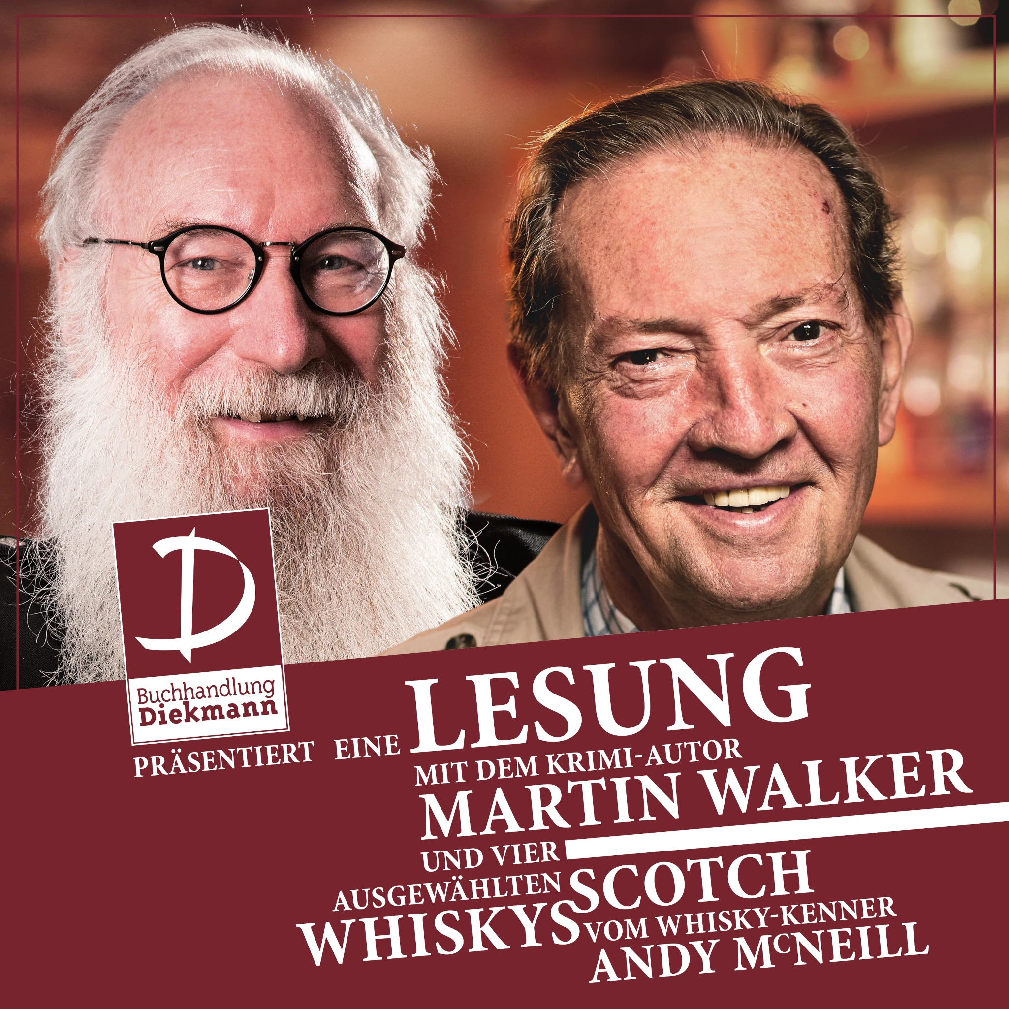 Wir laden zu einem besonderen Event ein: Der renommierte Autor Martin Walker – bekannt für seine „Bruno“-Kriminalromane – kommt mit Andy McNeill zusammen für einen Abend, an dem sich die beiden gebürtigen Schotten über gute Whiskys, gute Bücher und das Leben an sich austauschen werden.